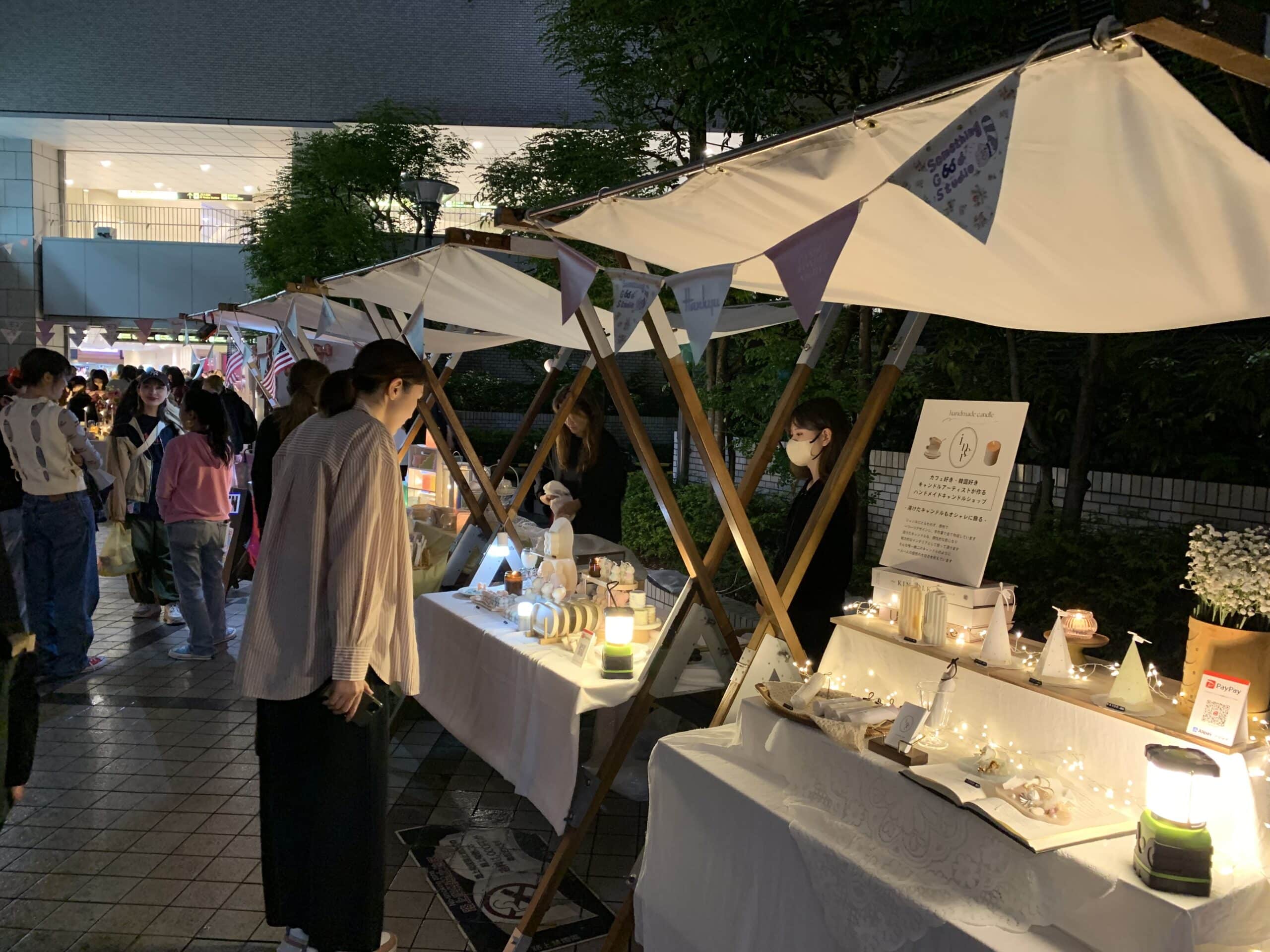 マルシェを数台並べ、キャンドルアーティストがそれぞれ手づくりのオリジナルキャンドルに明かりを灯し展示、販売されており来場のお客様を魅了していました。